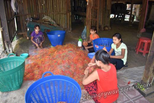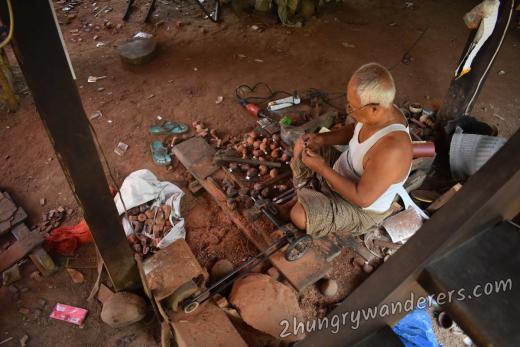 During the tour we saw many small workshops and everywhere we stopped felt more like visiting a friendly family than a shop. Everybody offered us snacks and drinks, I loved sitting on the floor and talking with the locals while enjoying homemade delicacies and tea. There was zero pressure to buy the products and all prices were surprisingly low - for example 2000 kyat ($1.50) for a handmade bamboo hat or 10000 kyat ($6.50) for a teak pipe is a lot closer to the manufacturing cost than to inflated price for tourists. Mr Anthony showed us and explained how things were made, throwing a joke here and there and even demonstrating things himself - you can see him in action in the video from the rubber band factory below.