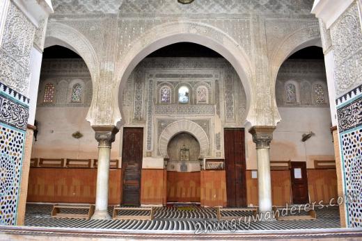 One of the very few religious sites in Fes where non Muslims are allowed to enter is this madrasa (school). In the past this complex was both an educational center and a mosque, the minaret is still standing and is visible from most of the city, commonly photographed trough the horseshoe shape of The Blue Gate. Interesting features are the marble columns in the mosque, all walls are covered in colorful zellige (tiles), and the delicate carvings on the cedar friezes match the patterns on the plaster panels.