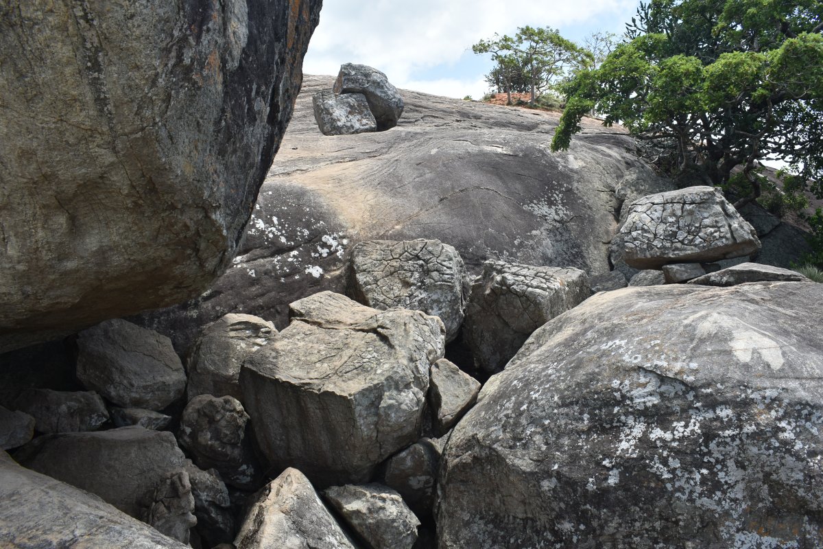 Exploring the top is also a nice way to relax, the sloped rock was not suitable for large scale construction like its famous neighbour, but the ancient people have left their mark there as well. Two small stupas are now just piles of bricks being taken over by cacti. Looking at the ground we discovered some very symmetrical channels in the rock, probably used to hold wooden foundations of buildings.